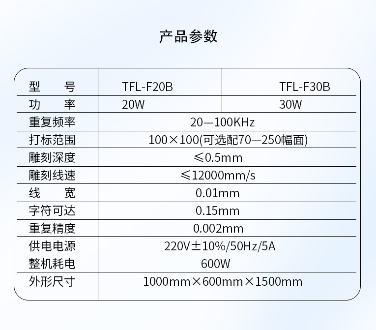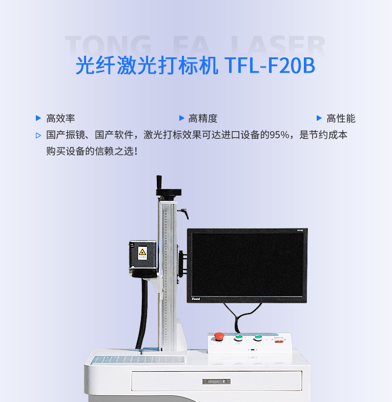 通發(fā)激光研發(fā)的TFL-F20B激光打標機,金屬材質(zhì)和塑膠材質(zhì)均可進行打標加工。本激光鐳雕機光纖激光器、振鏡、軟件、聚焦鏡等核心配件采用原裝進口,性能穩(wěn)定,壽命是國產(chǎn)器件的1.5倍,是高端客戶的優(yōu)選。